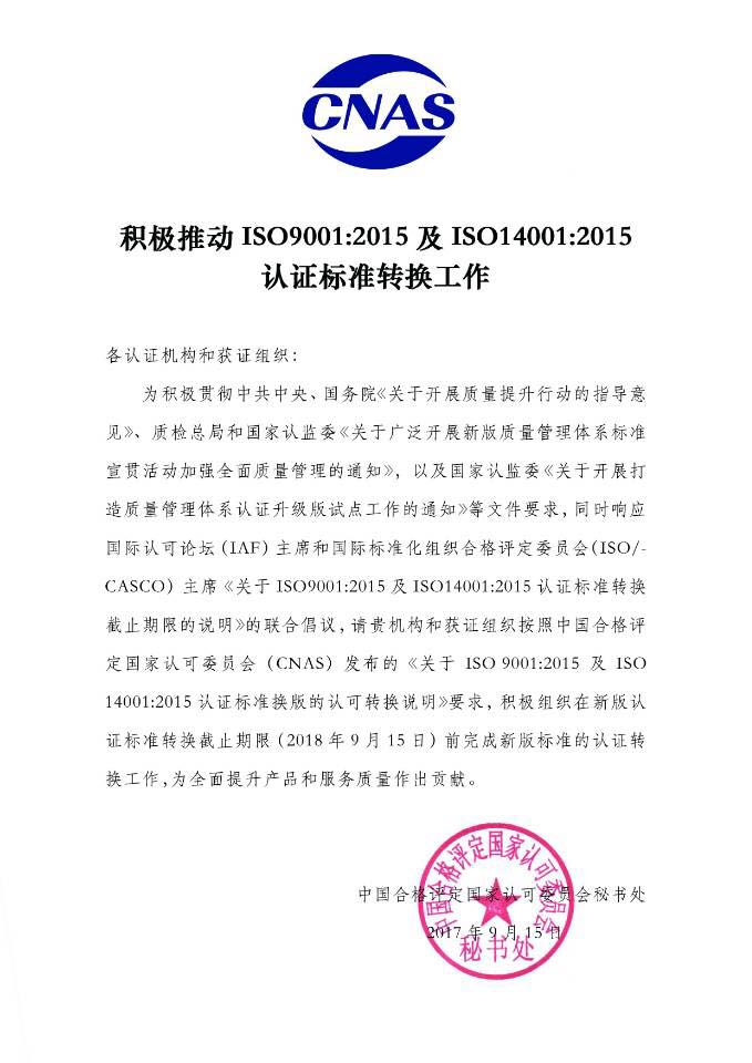 为积极贯彻中共中央、国务院《关于开展质量提升行动的指导意见》、质检总局和国家认监委《关于广泛开展新版质量管理体系标准宣贯活动加强全面质量管理的通知》以及国家认监委《关于开展打造质量管理体系认证升级版试点工作的通知》等文件要求,同时响应国际认可论坛(IAF)主席和国际标准化组织合格评定委员会(ISO/CASCO)主席《关于ISO 9001:2015 及1SO 14001:2015 认证标准转换截止期限的说明》的联合倡议,请各获证组织按照中国合格评定国家认可委员会(CNAS) 发布的《关于ISO 9001:2015 及ISO 14001:2015 认证标准换版的认可转换说明》要求,积极组织在新版认证标准转换截止期限(2018年9月15 日)前完成新版标准的认证转换工作,为全面提升产品和服务质量做出贡献。
