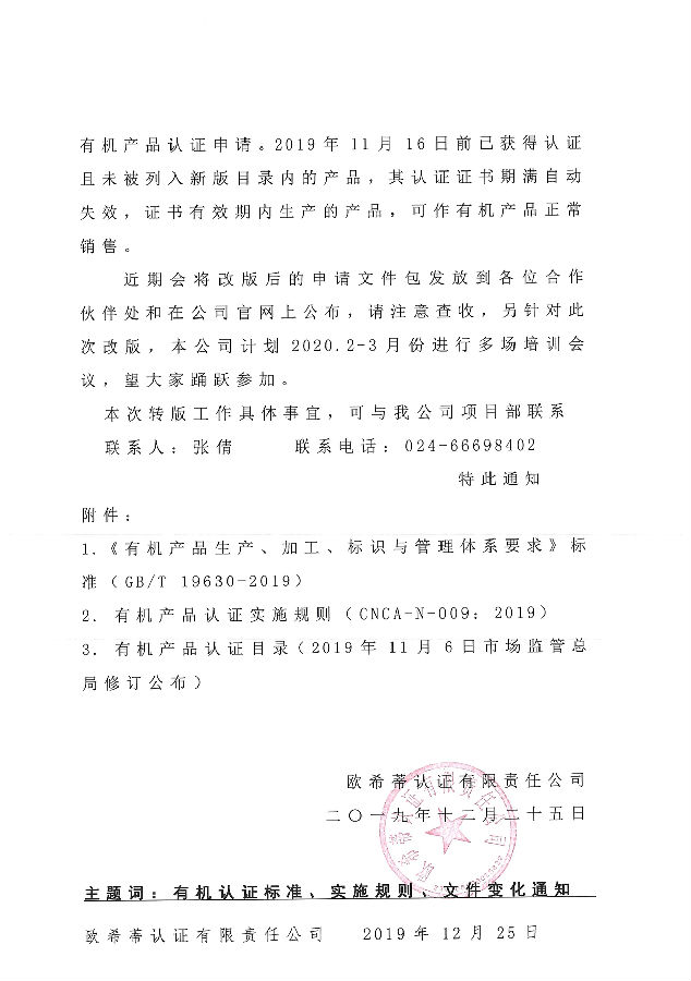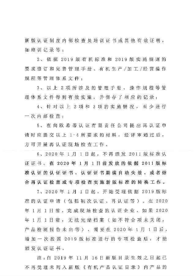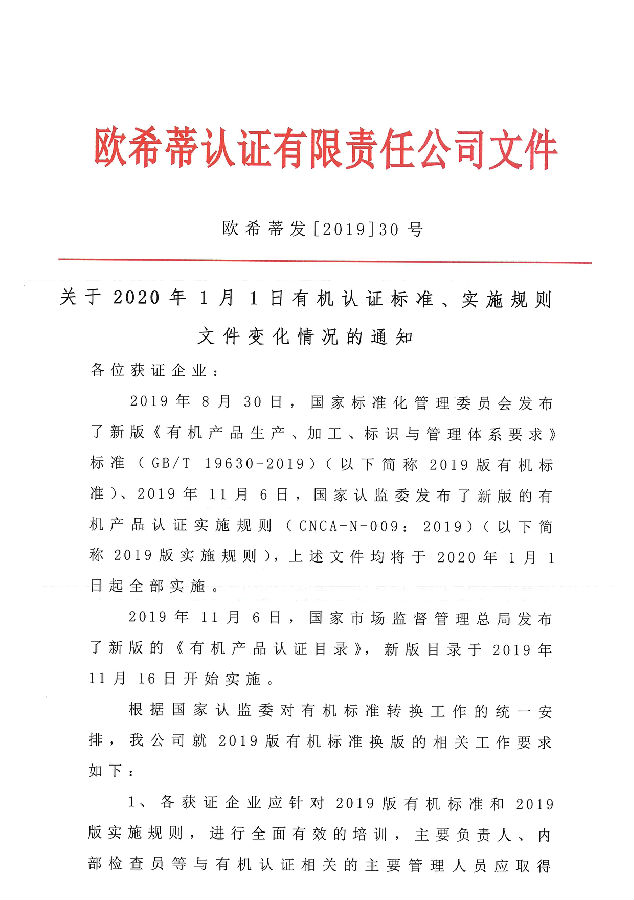 关于2020年1月1日有机认证标准、实施规则文件变化情况的通知