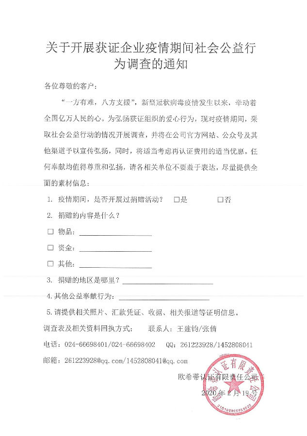 关于开展获证企业疫情期间社会公益行为调查的通知